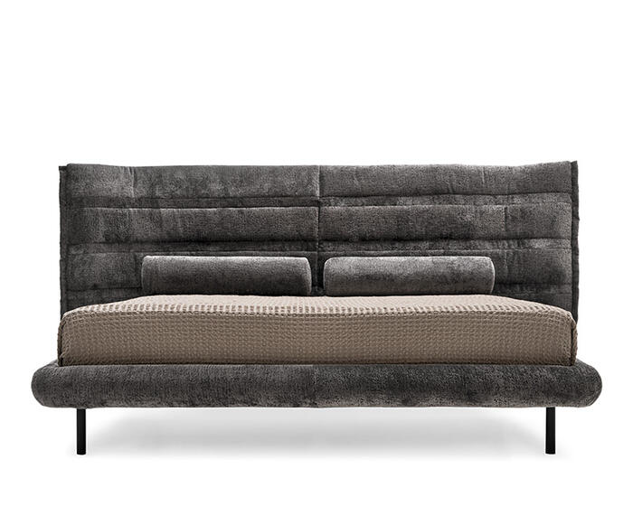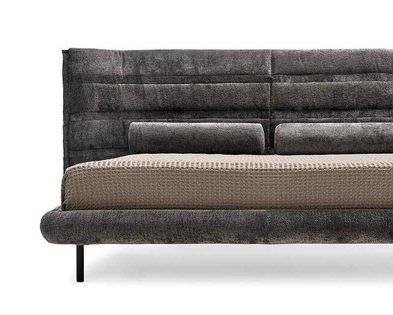 Vertical and horizontal seams articulate the upholstery, forming a subtle graphic pattern with sartorial references. This careful detailing adds rhythm and depth to the surface, while reinforcing the bed’s welcoming, almost embracing character—designed to support rest without visual heaviness.