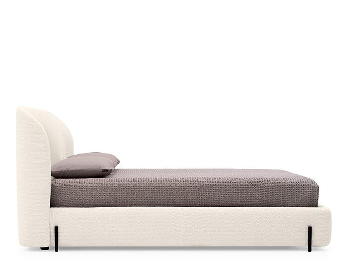 Inspired by the armchair of the same name, with which it creates a cohesive bedroom setting, Rendez Vous is distinguished by the visual lightness of its structure. The bed frame is raised on four slender feet, each refined with a metal detail that subtly accents the design. Fully finished, Rendez Vous combines graceful form with careful craftsmanship, allowing placement both against a wall or more freely within the space.