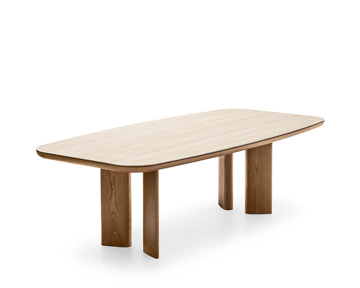 Sandy is a collection of tables that feature a teardrop leg, a cross-section with a sophisticated design that can accommodate different table top geometries – rectangular, round or oval, both fixed and extendable.