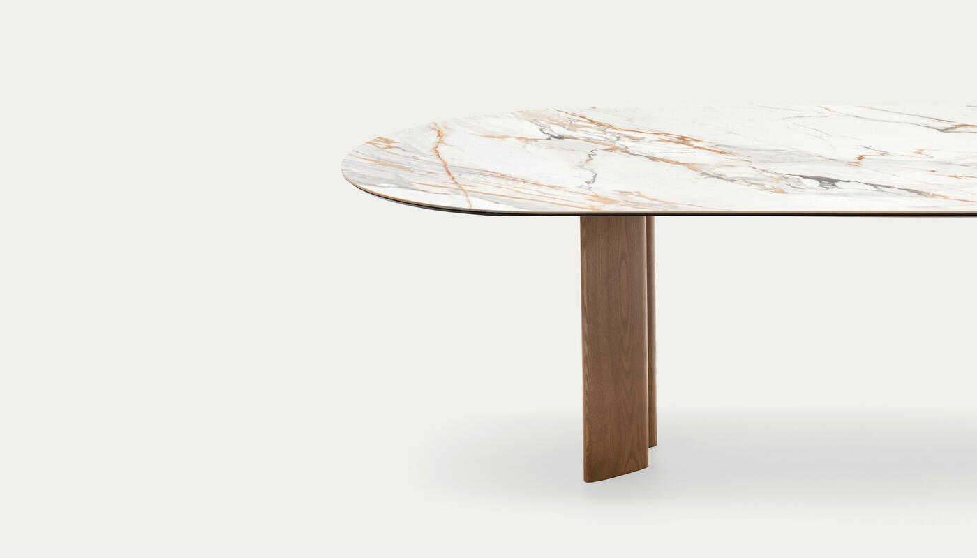 Sandy is a collection of tables that feature a teardrop leg, a cross-section with a sophisticated design that can accommodate different table top geometries – rectangular, round or oval, both fixed and extendable.