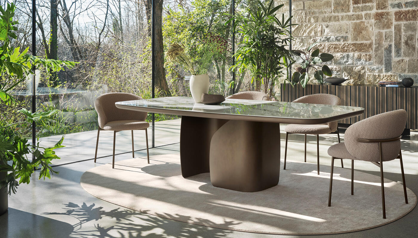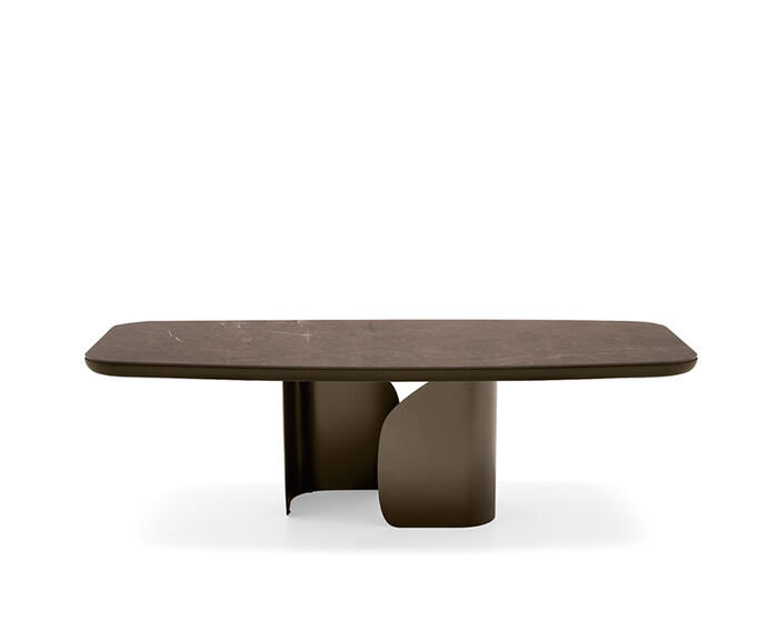 Twins is a dining table with a striking visual appeal, featuring a unique base composed of two curved, molded metal elements that create the illusion of the tabletop taking flight. With a wide range of finishes available, you can customize Twins to suit either a classic or modern aesthetic.