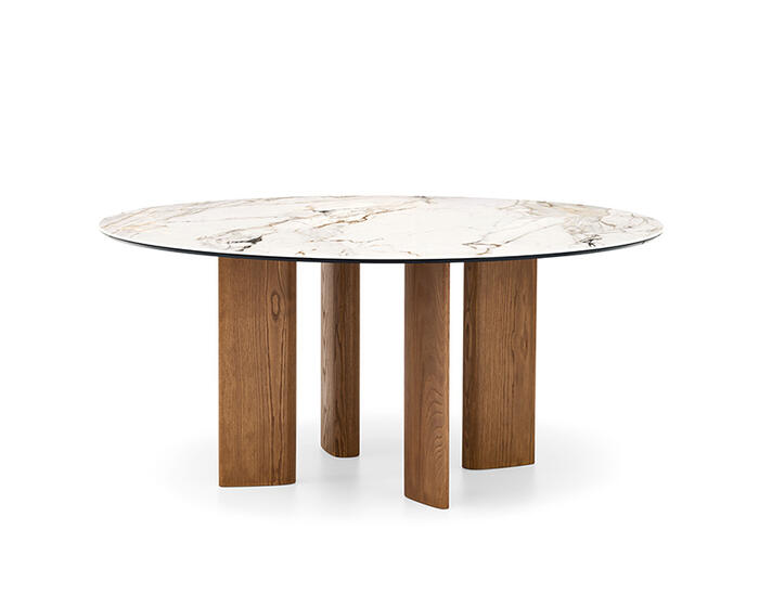 Sandy is a collection of tables that feature a teardrop leg, a cross-section with a sophisticated design that can accommodate different table top geometries – rectangular, round or oval, both fixed and extendable.