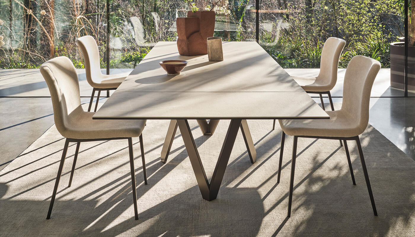 The CARTESIO extendable table showcases timeless elegance with its iconic design, offering a range of ceramic tabletop options supported by a unique, coated metal frame. This frame is constructed from four independent rectangular "V" elements.