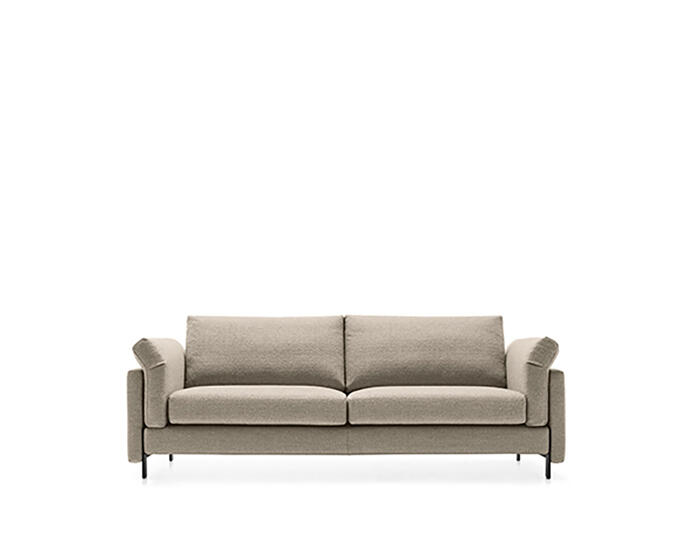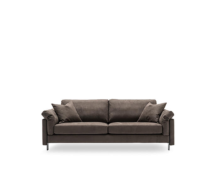 Meridien is a sofa shaped by clarity and restraint. Straight, elegant lines define its compact frame, lightly raised on slender painted metal feet that lend the design a sense of ease and proportion. The structure remains precise, allowing the softness of the cushions to take the lead.