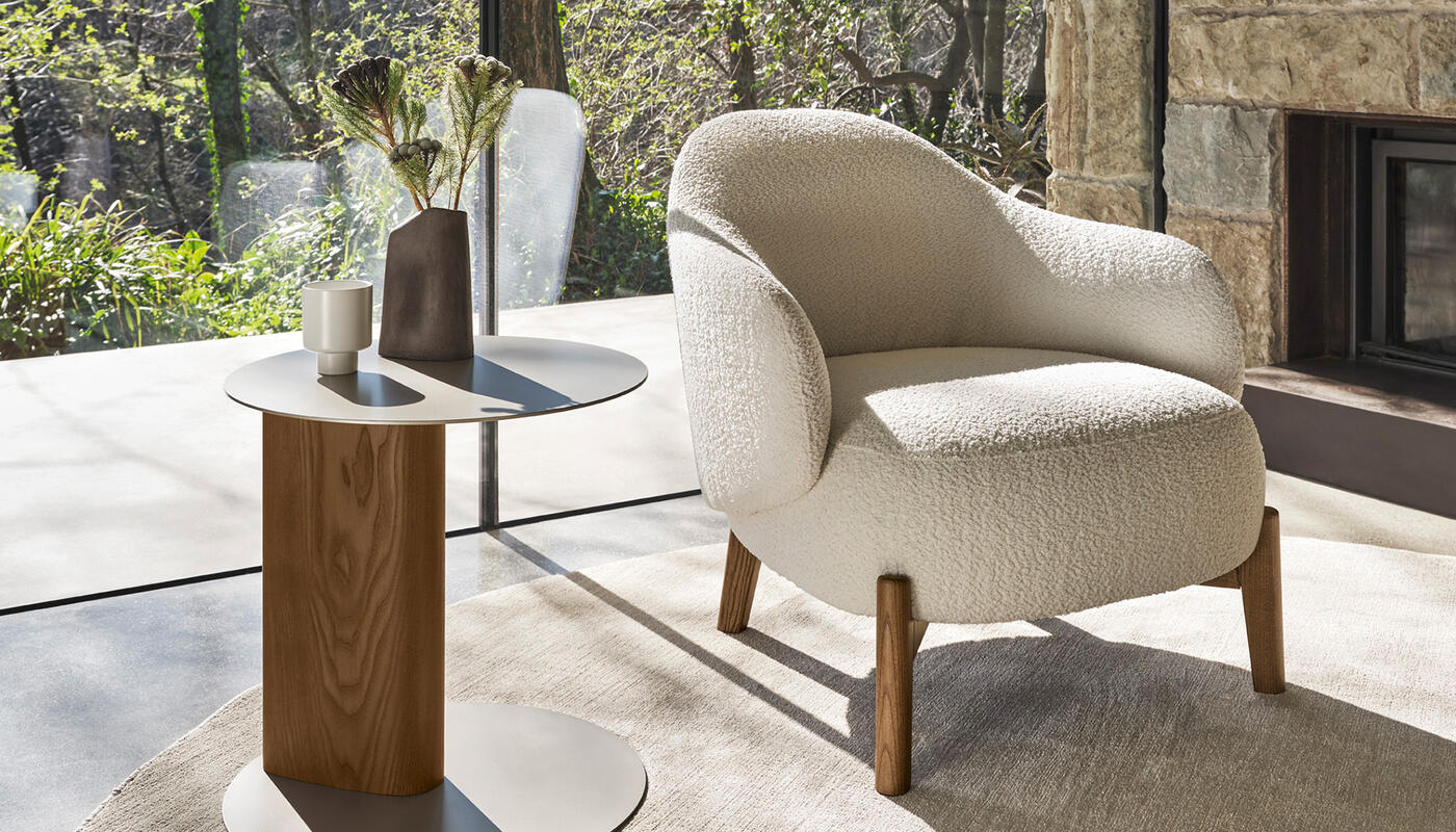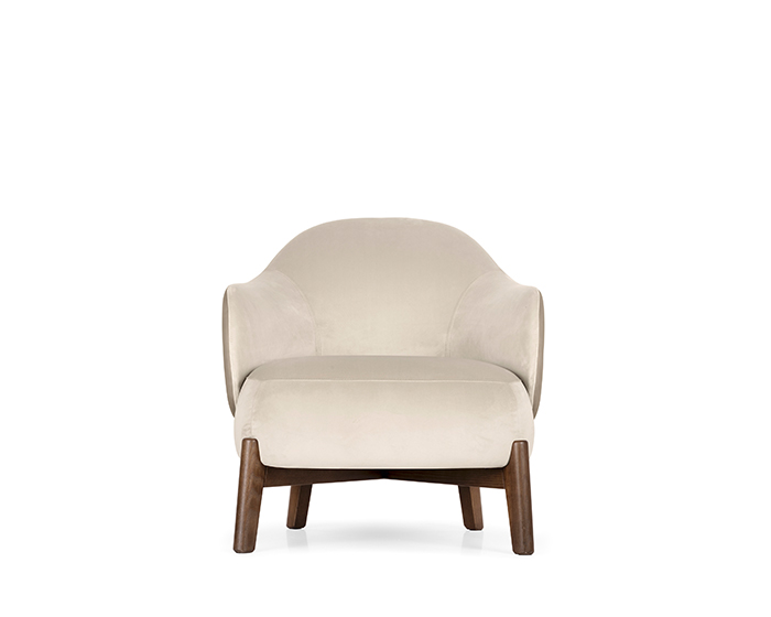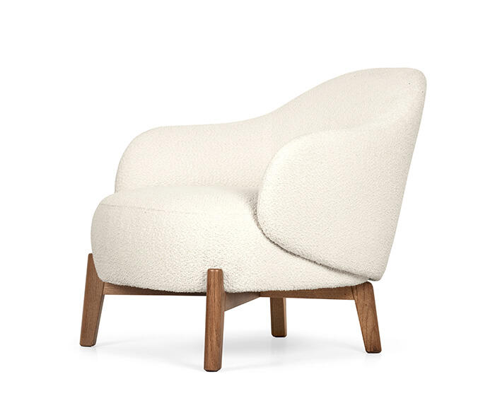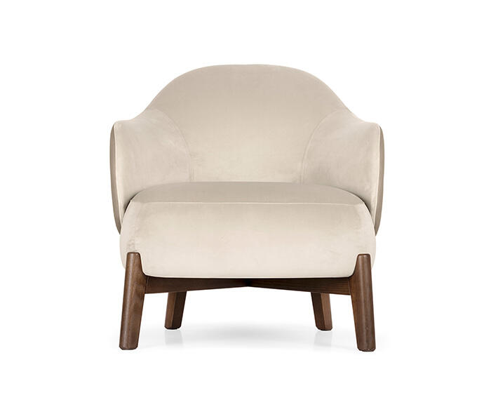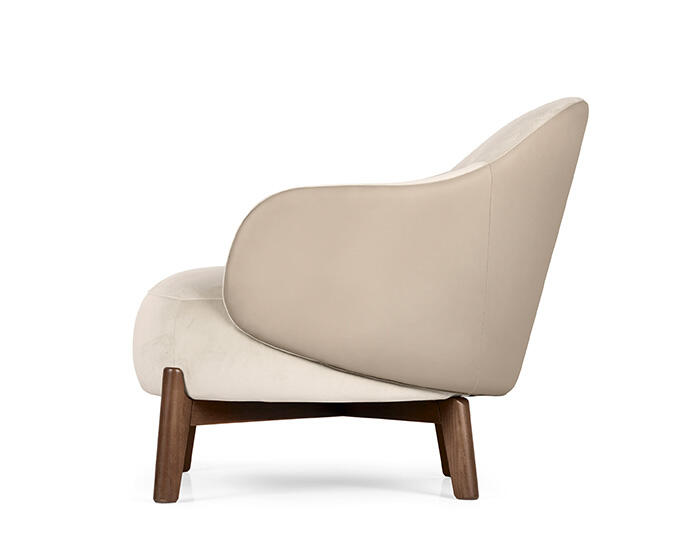 Holly Fab translates the soft elegance of the Holly family into a more generous, relaxed form. Inspired by 1950s design, the armchair is defined by a wrap-around backrest that flows seamlessly into the armrests, creating an open yet embracing silhouette. Expanded proportions enhance its leisurely character, while the subtly raised front foot adds a refined architectural detail. Designed for unhurried moments, Holly Fab balances comfort with a quietly expressive presence.