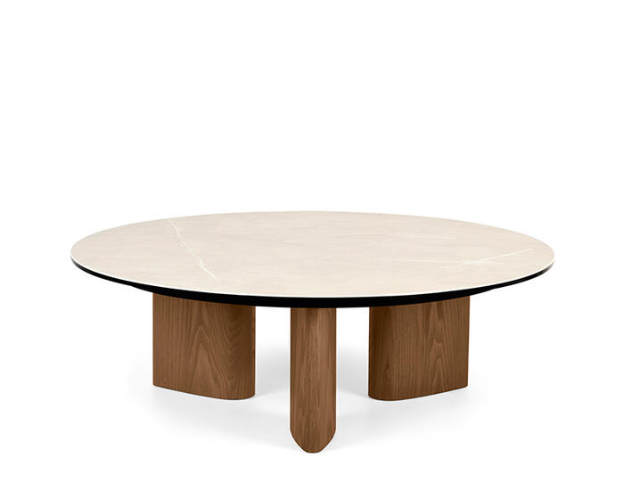 The Sandy large round coffee table is part of an extensive collection that includes coffee tables and a console table, all unified by the distinctive teardrop-shaped leg. Its sloping cross-section creates a striking three-dimensional effect, giving the base a sculptural quality that remains consistent across the range.