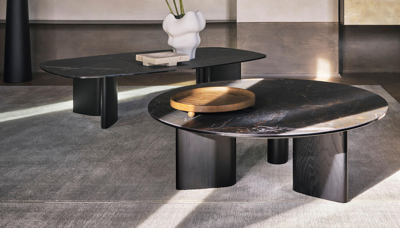 In this large round version, the design emphasizes balance and continuity, translating the collection’s defining element into a generously proportioned surface. Like the other Sandy tables—from classic coffee tables to console tables with two legs and smaller side tables with a central pillar—it offers a cohesive presence within the living space.