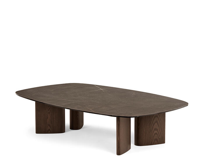 In this larger coffee table version, the elliptical top is supported with balance and visual continuity, expressing the same design language found across the Sandy family—from classic coffee tables to console tables with two legs and smaller side tables with a central pillar. The result is a coherent form that feels both expressive and grounded within the living space.