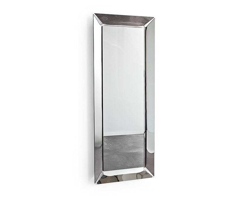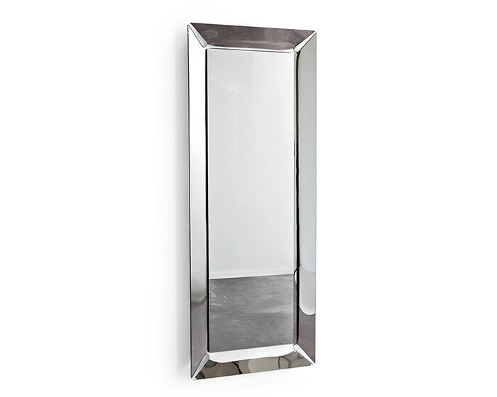 A distinctive 10 cm-wide frame made from curved silvered glass surrounds the reflective surface, introducing brightness and depth while giving the mirror its character. Balanced and visually clear, Pleasure integrates easily into hallways, living rooms, and bedrooms, where it enhances the space through light and reflection rather than ornament.