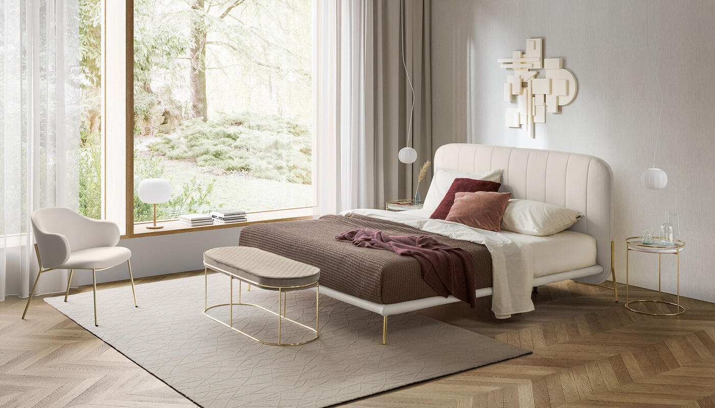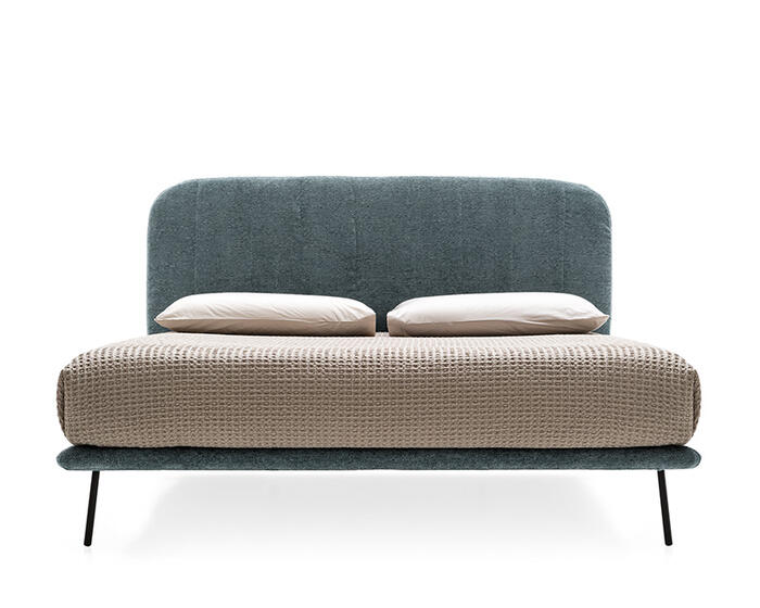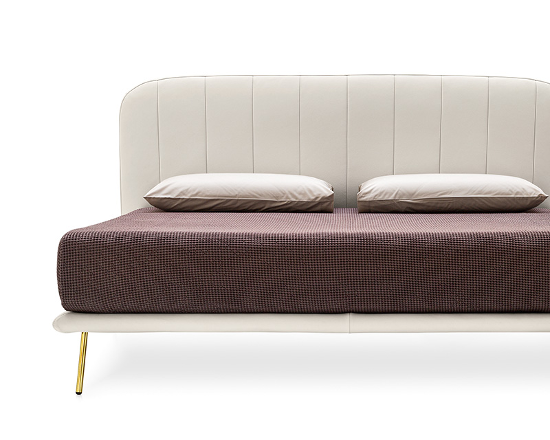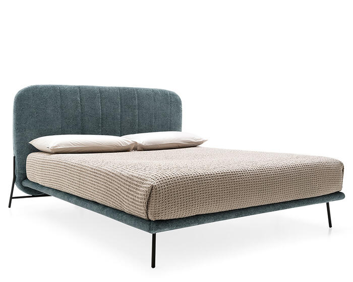A slender metal base supports the upholstered bed frame, lending visual lightness and a sense of suspension. The rounded headboard, detailed with vertical seams, introduces a gentle counterpoint to the structure, while the mattress rests on a concealed slatted base upholstered in fabric. Balanced and fluid in form, Le Marais brings a refined yet relaxed presence to the bedroom.
