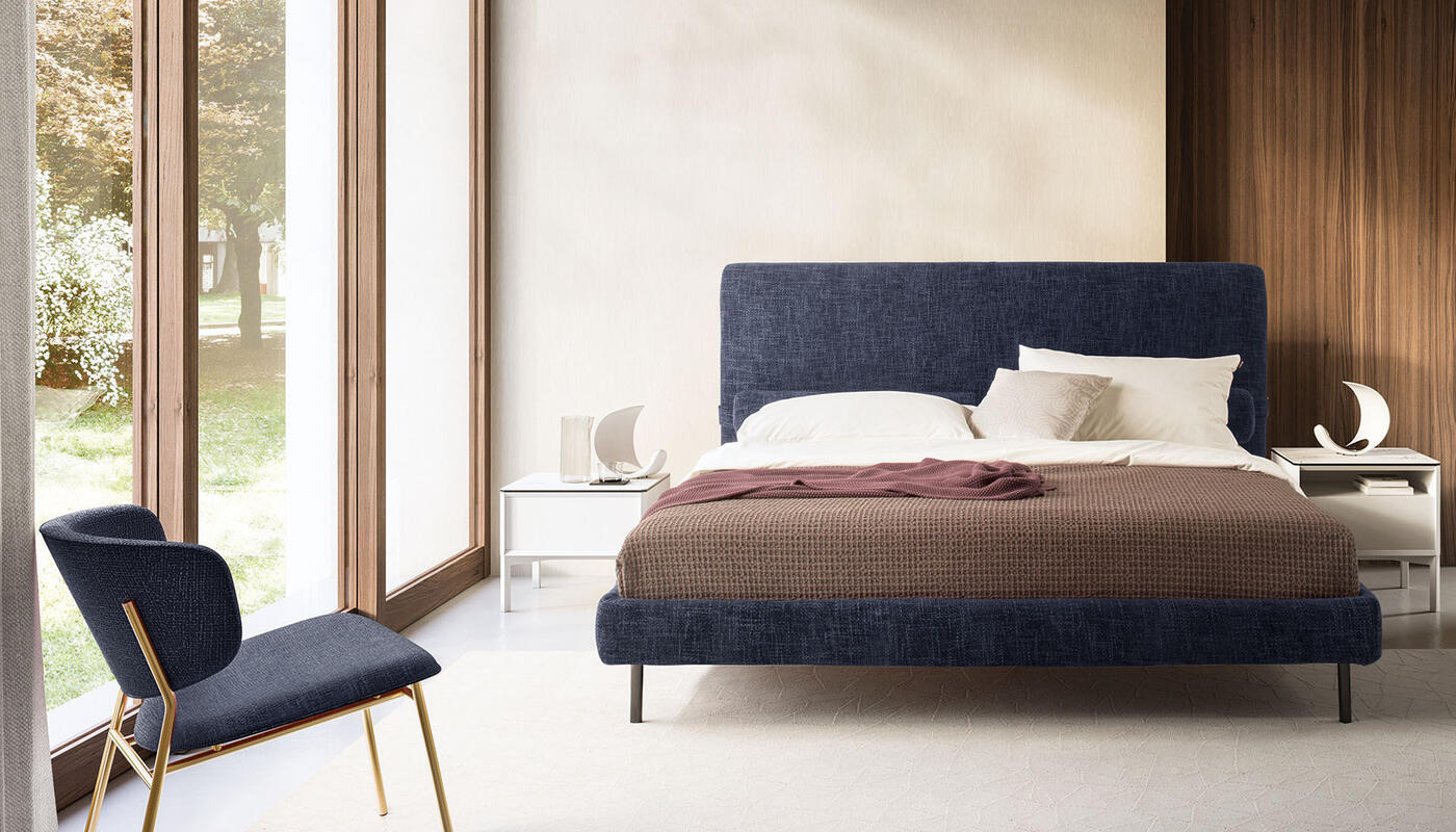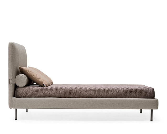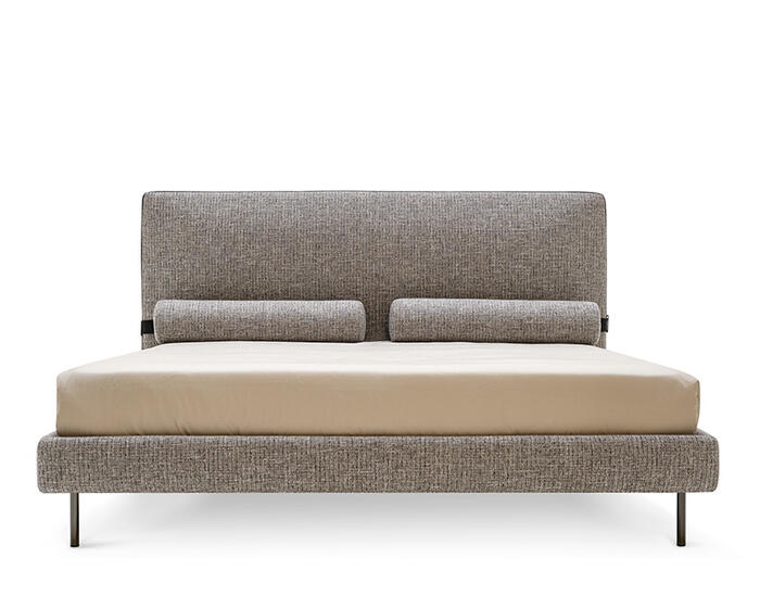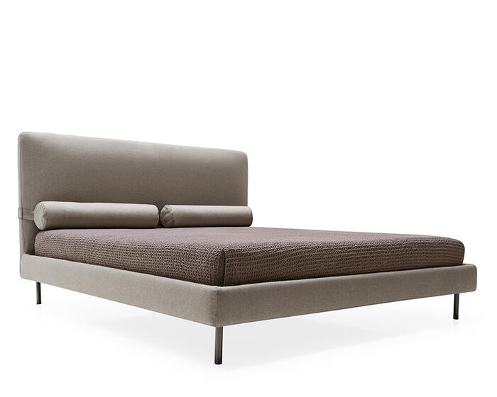 The headboard’s clean, continuous surface reinforces the bed’s linear character, offering generous support for reading or watching television. Optional bolster cushions, discreetly secured with a magnetic fastening, add functional comfort while maintaining an orderly, refined appearance. Available upholstered in fabric or leather, Mies combines clarity of form with a considered approach to everyday comfort.